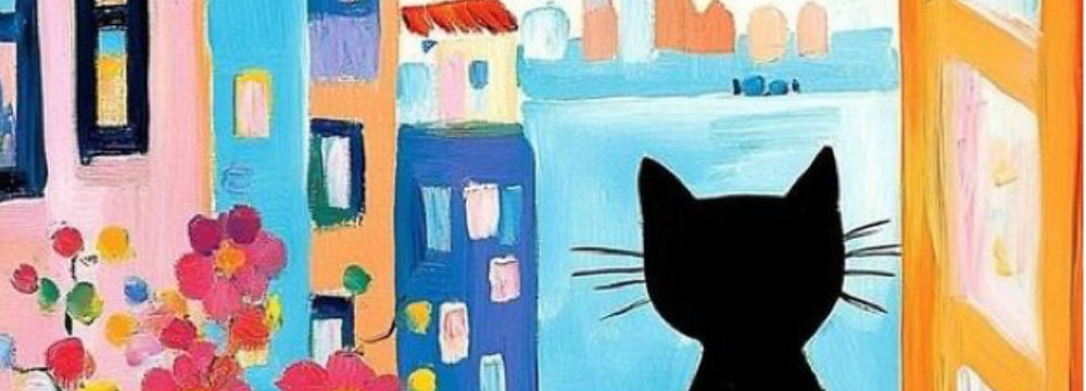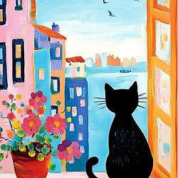 A small black kitty sits on a cozy windowsill with its tail curled beside a pot of pink flowers, gazing out at colorful buildings and a calm stretch of water in the distance with Gouache.
